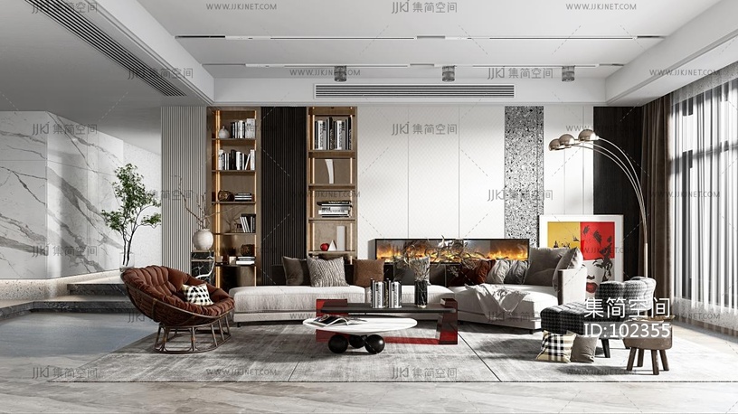 中古风客厅,美式客厅,圆形茶几,装饰画,移动电视,3d模型下载