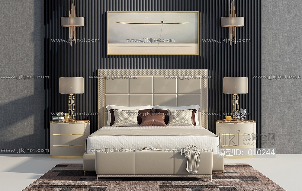 H43-1107现代简欧法式双人床床头柜靠包抱枕壁灯 3d模型下载 [模型ID:10244]