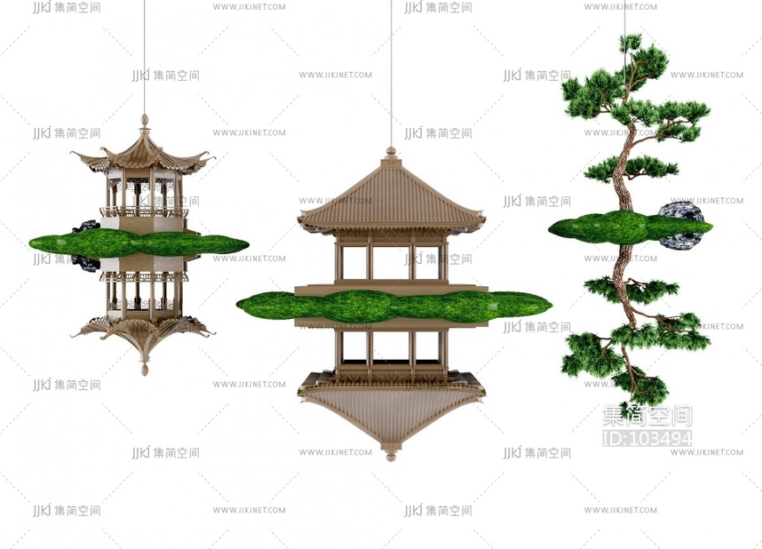 新中式亭子镜像倒影吊饰,挂件, 3d模型下载 [模型ID:103494]