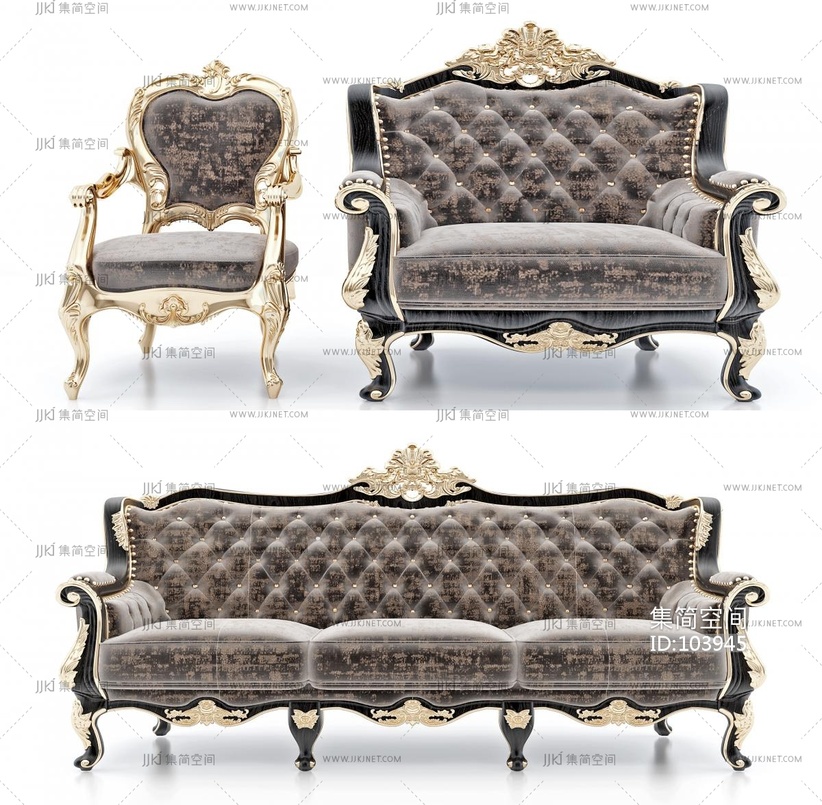 法式古典雕花绒布皮革多人沙发组合 3d模型下载 [模型ID:103945]
