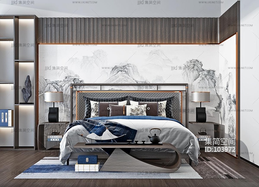 新中式实木双人床组合 3d模型下载 [模型ID:103972]