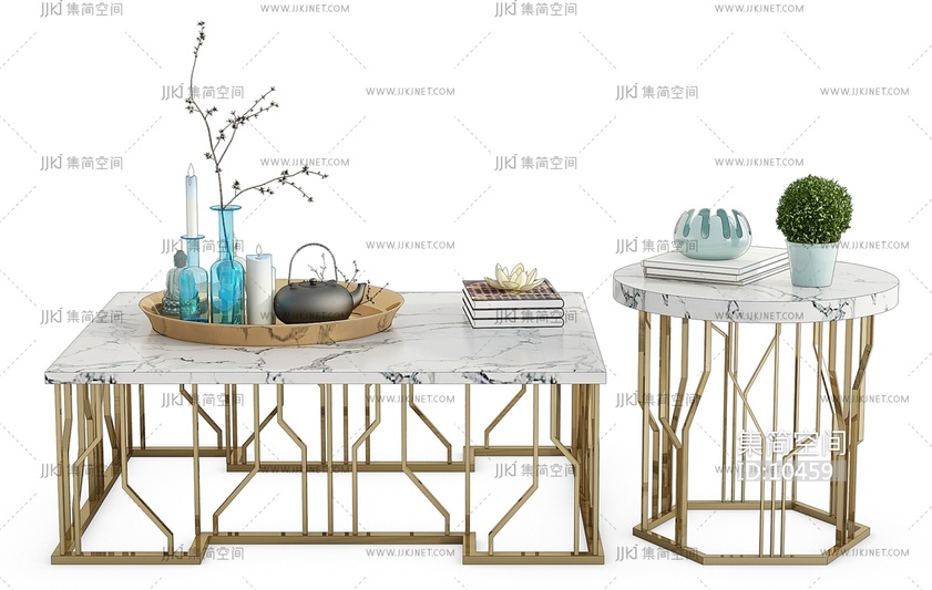 H09-1103现代金属大理石茶几摆件组合 3d模型下载 [模型ID:10459]