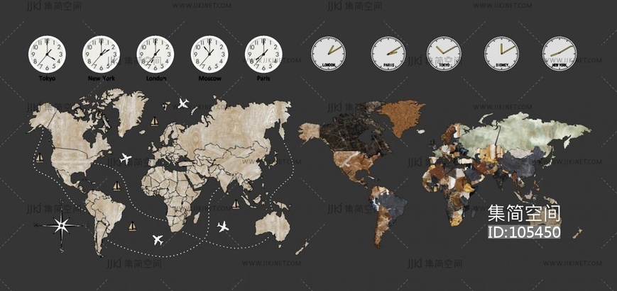 现代宾馆酒店世界地图时钟,石英钟,钟表挂饰挂件墙饰挂件 su草图模型下载 [模型ID:105450]