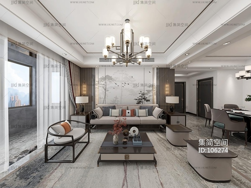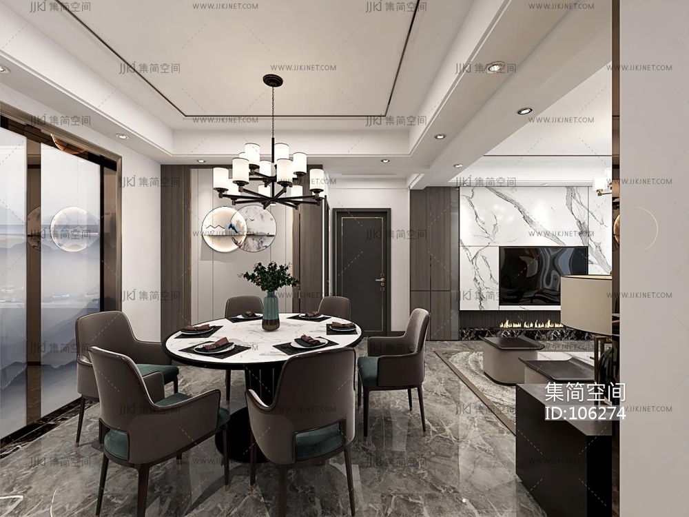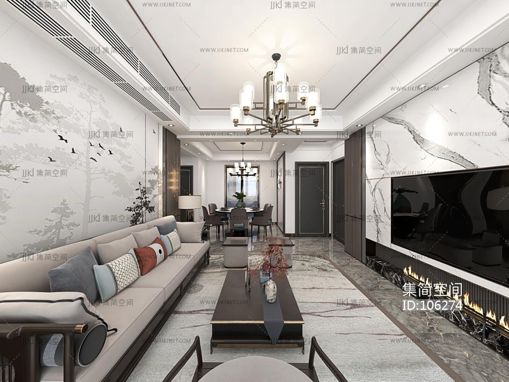 120平新中式,客厅沙发餐厅 3d模型下载 [模型ID:106274]