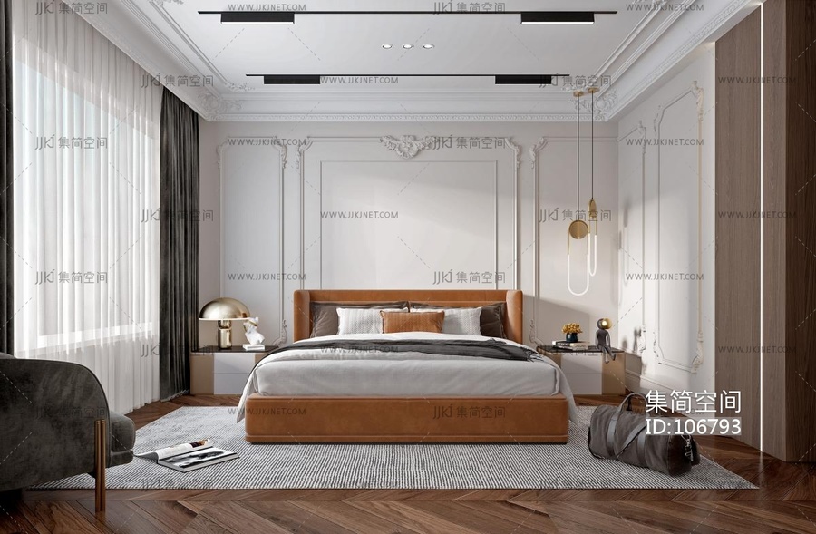 卧室,轻奢,暗黑风,现代轻奢卧室双人床,懒人沙发法式卧室3d模型下载