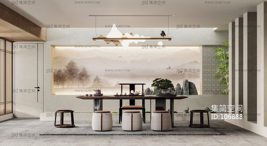现代书房 书桌椅 壁柜 挂画 吊灯 书 盆栽 摆件3d模型下载