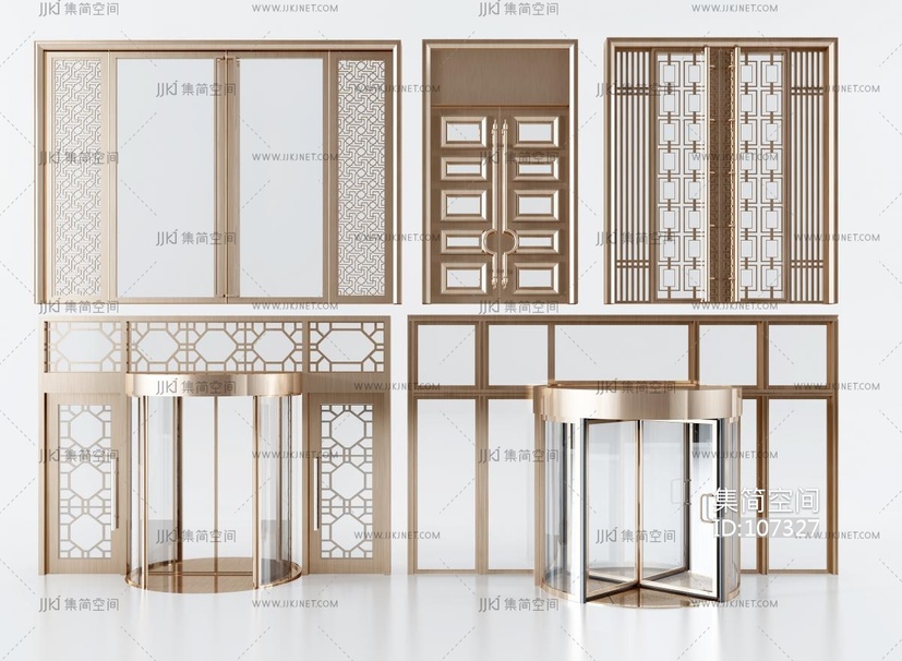 新中式大堂旋转门,双开门,铜门组合 3d模型下载 [模型ID:107327]