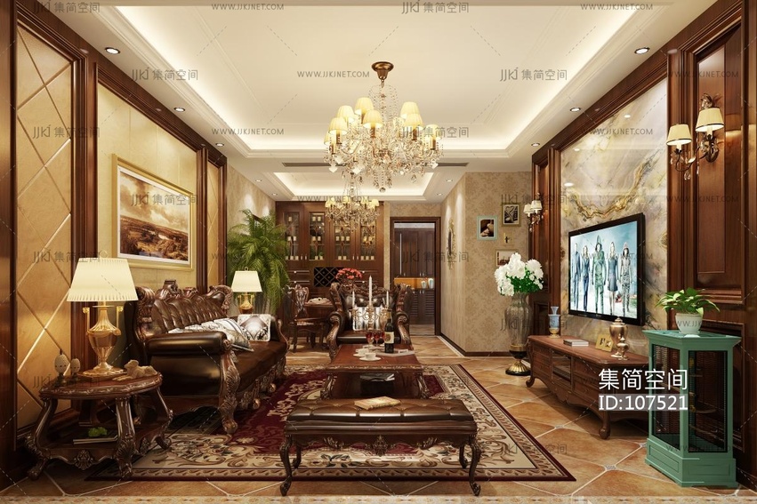 中古风客厅,美式客厅,圆形茶几,装饰画,移动电视,3d模型下载