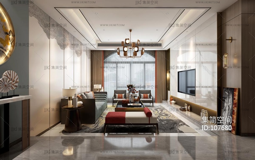 中古风客厅,美式客厅,圆形茶几,装饰画,移动电视,3d模型下载