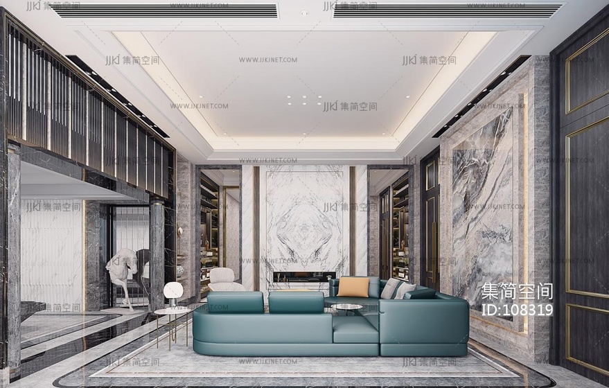 中古风客厅 沙发茶几组合 背景墙3d模型下载