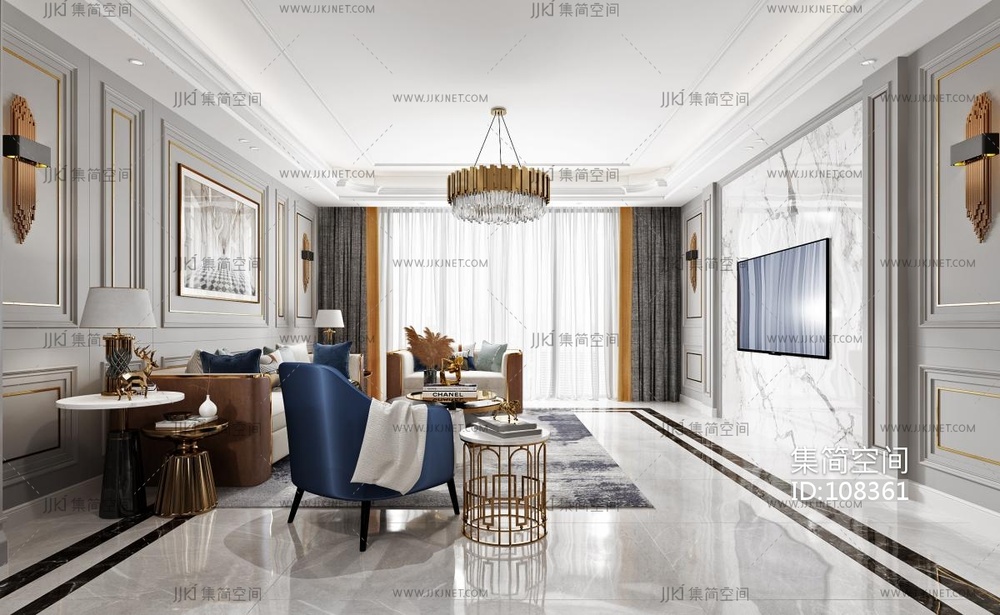 中古风客厅,美式客厅,圆形茶几,装饰画,移动电视,3d模型下载