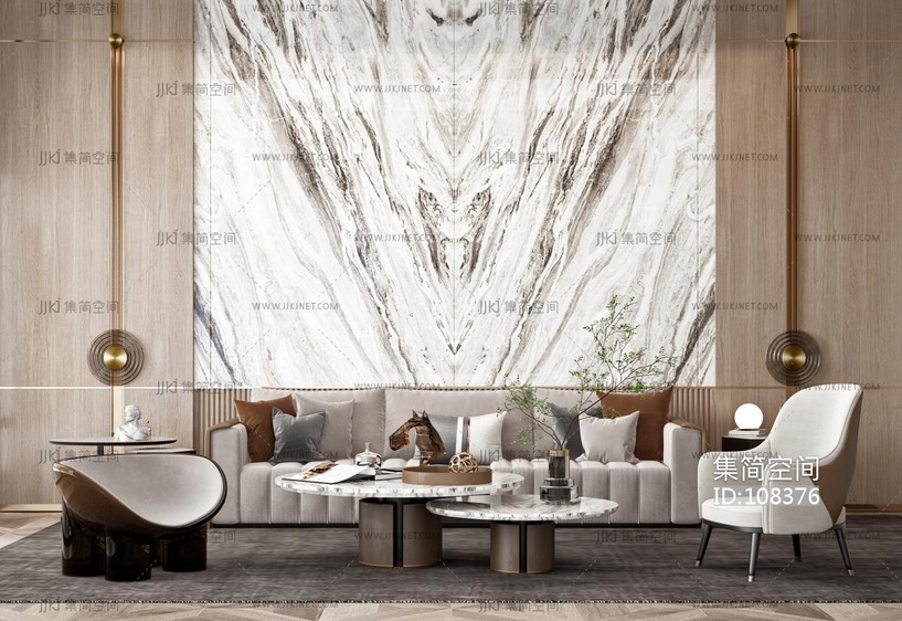 中古风客厅 沙发茶几组合 背景墙3d模型下载