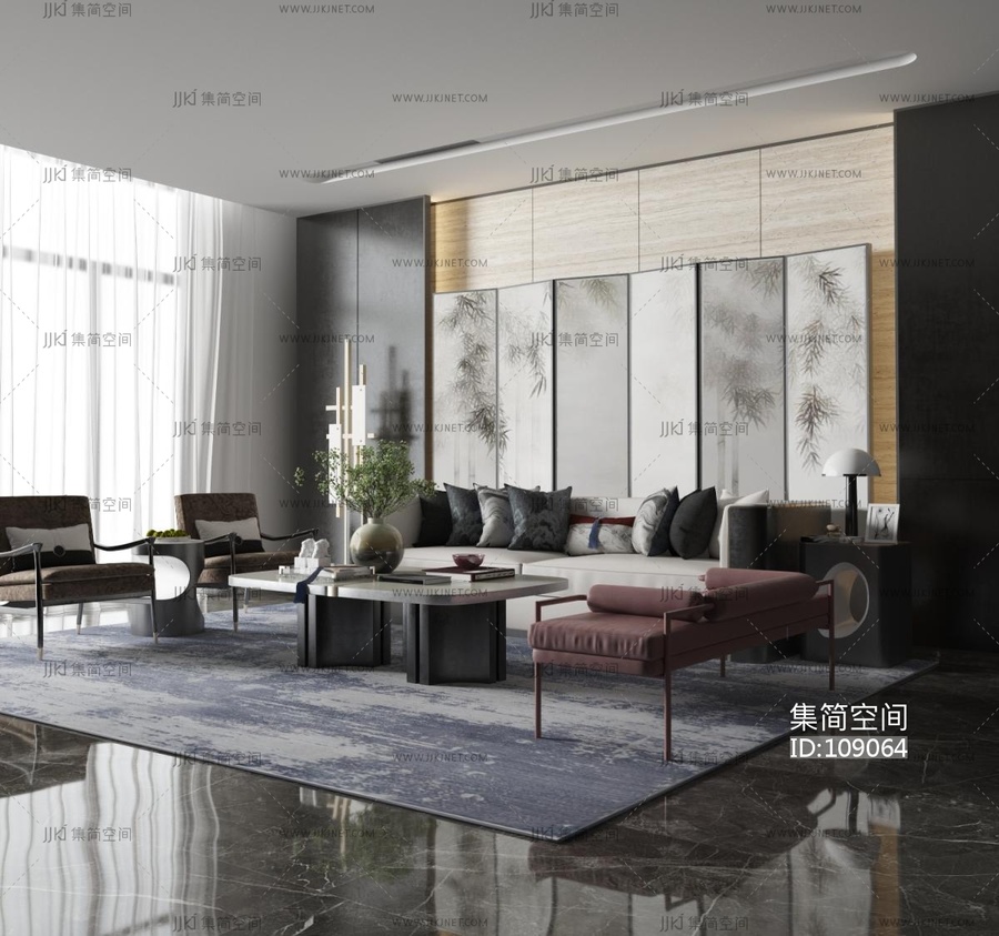 中古风客厅 沙发茶几组合 背景墙3d模型下载