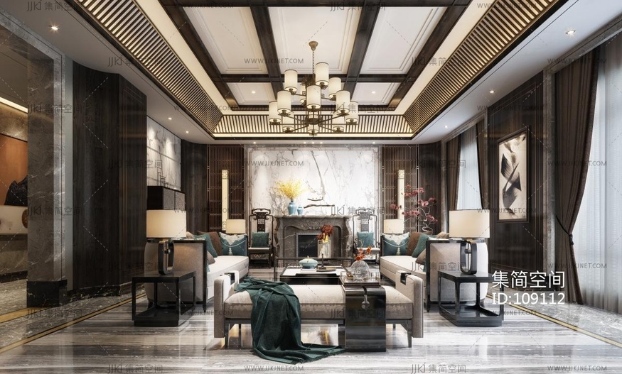 中古风客厅 沙发茶几组合 背景墙3d模型下载