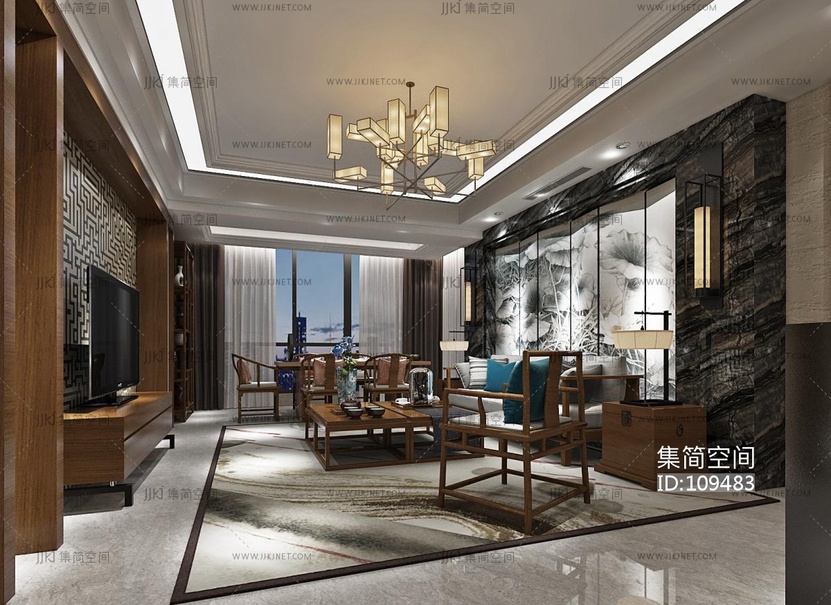 中古风客厅 沙发茶几组合 背景墙3d模型下载
