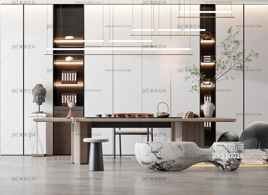 现代书房 书桌椅 壁柜 挂画 吊灯 书 盆栽 摆件3d模型下载