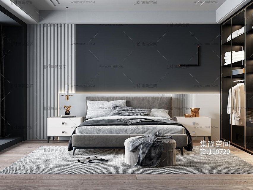 卧室,轻奢,暗黑风,现代轻奢卧室双人床,懒人沙发法式卧室3d模型下载