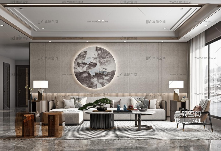中古风客厅 沙发茶几组合 背景墙3d模型下载