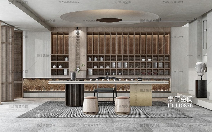 新中式茶室 茶桌 ,藤编编织吊灯,竹竿3d模型下载