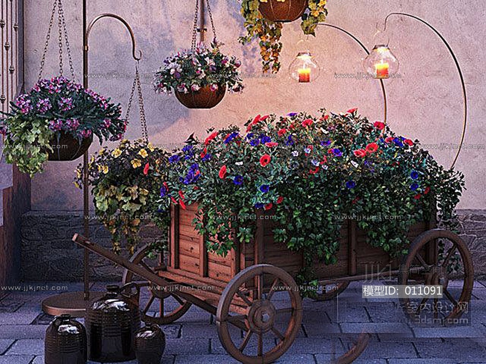 20花车植物吊篮花艺花店花车木车酒罐子 3d模型下载 [模型ID:11091]