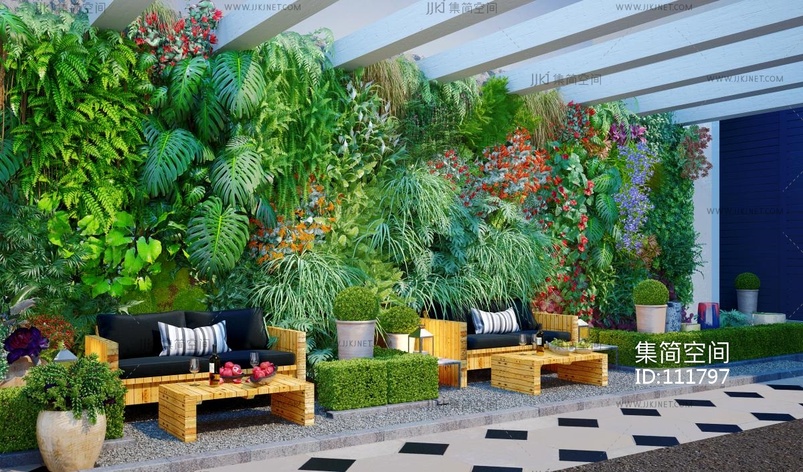 现代植物墙,庭院休息区, 3d模型下载 [模型ID:111797]