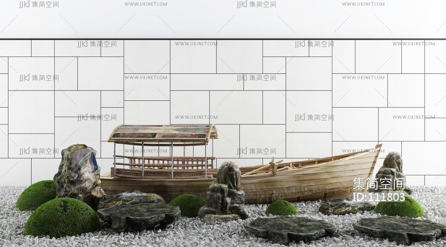 新中式景观小品,玄关造景 ,石头木船 3d模型下载 [模型ID:111803]