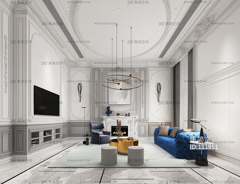 中古风客厅,美式客厅,圆形茶几,装饰画,移动电视,3d模型下载
