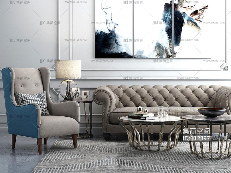 03-奶油中古沙发组合_沙发茶几组合_异形沙发_金属茶几_单人休闲椅_模块沙发3D模型3d模型下载