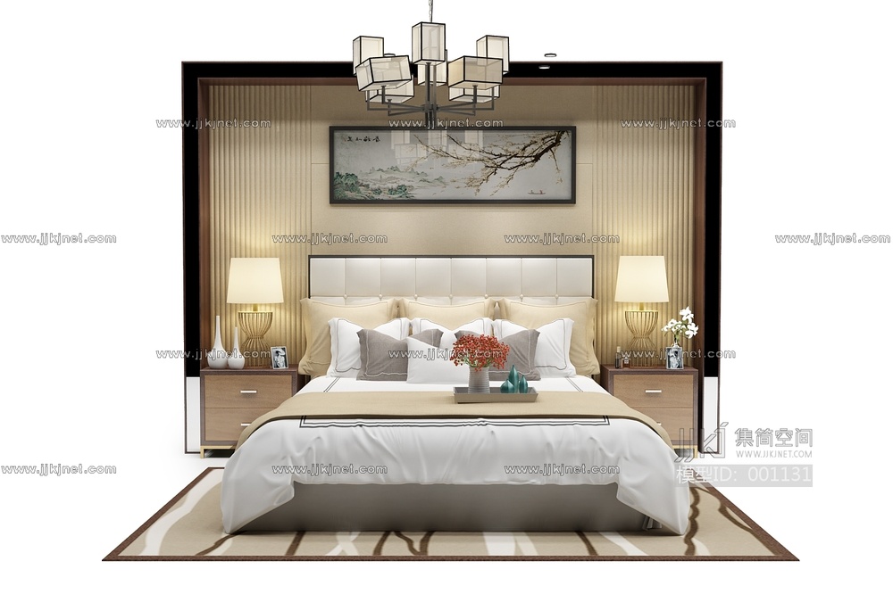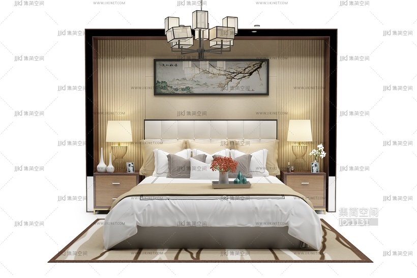 60新中式双人床卧室3d模型下载