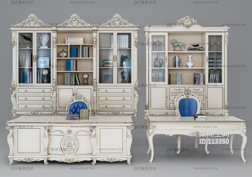 法式古典雕花书柜书桌椅子 3d模型下载 [模型ID:113350]