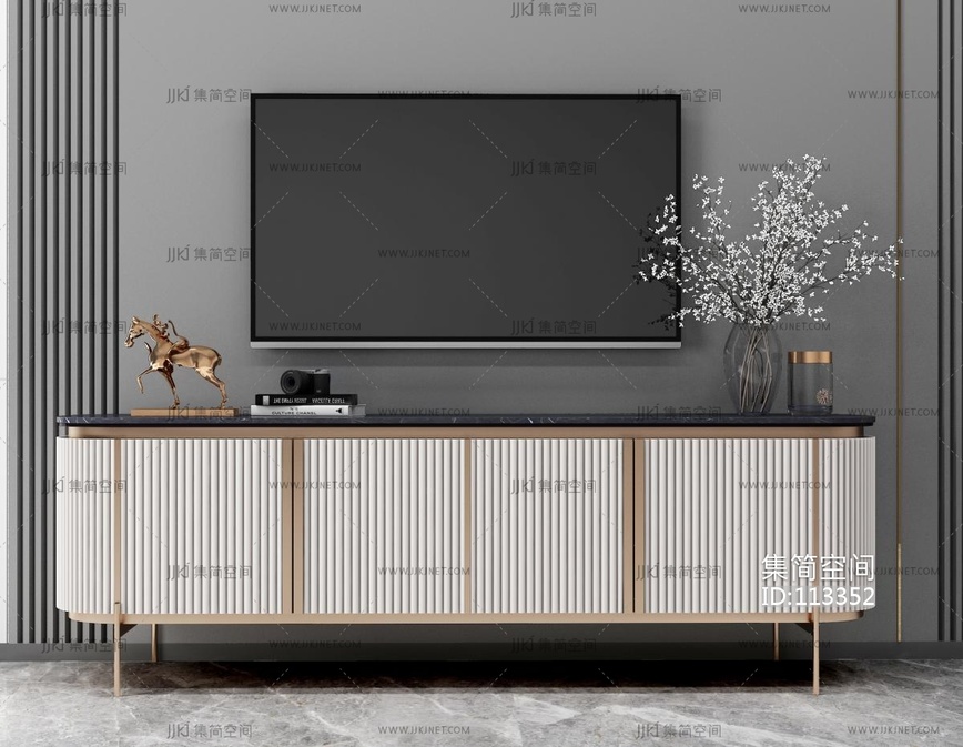 轻奢电视柜、电视、马雕塑、玻璃植物 3d模型下载 [模型ID:113352]