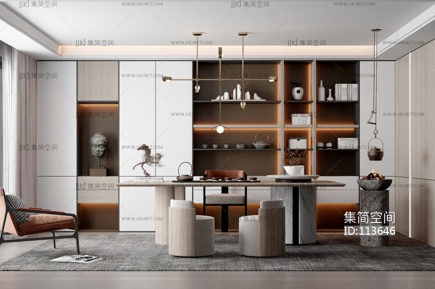现代书房 书桌椅 壁柜 挂画 吊灯 书 盆栽 摆件3d模型下载