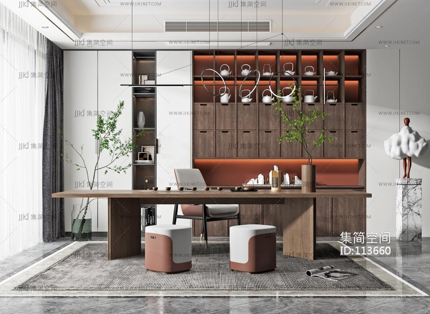 现代书房 书桌椅 壁柜 挂画 吊灯 书 盆栽 摆件3d模型下载