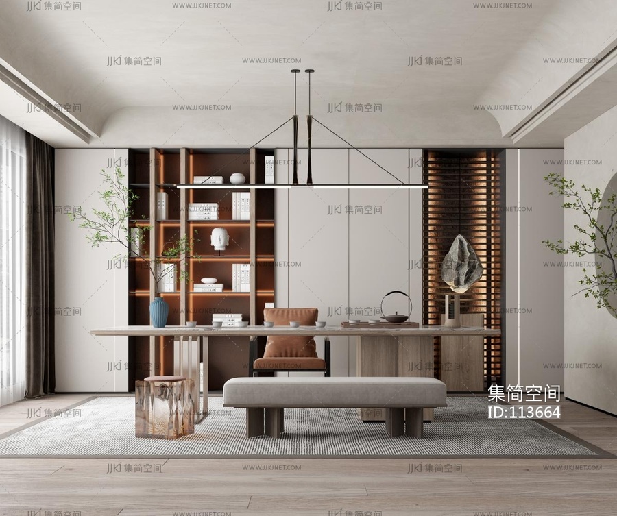 现代书房 书桌椅 壁柜 挂画 吊灯 书 盆栽 摆件3d模型下载
