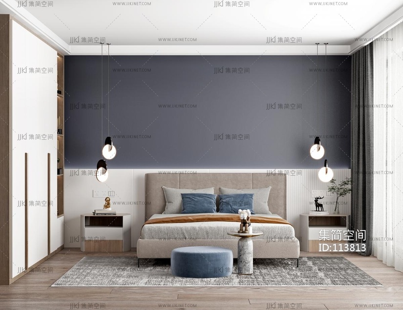 卧室,轻奢,暗黑风,现代轻奢卧室双人床,懒人沙发法式卧室3d模型下载