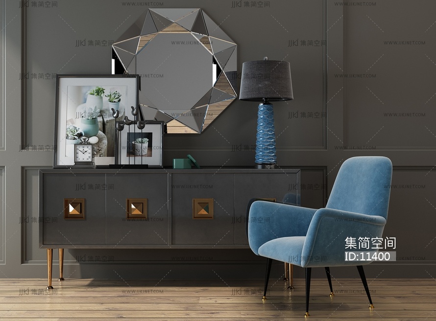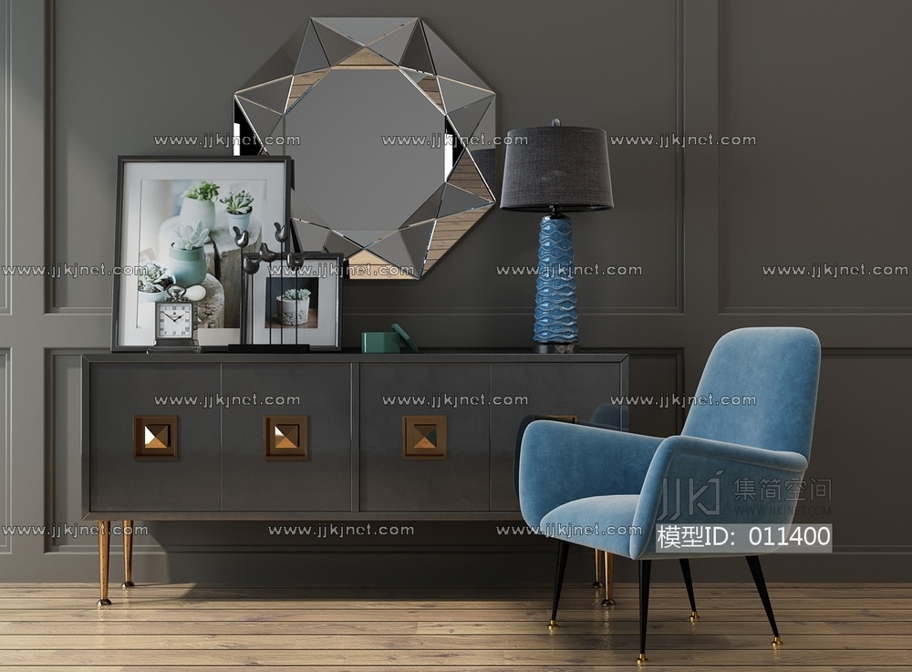 H27-1115简欧边柜单椅子镜子组合 3d模型下载 [模型ID:11400]