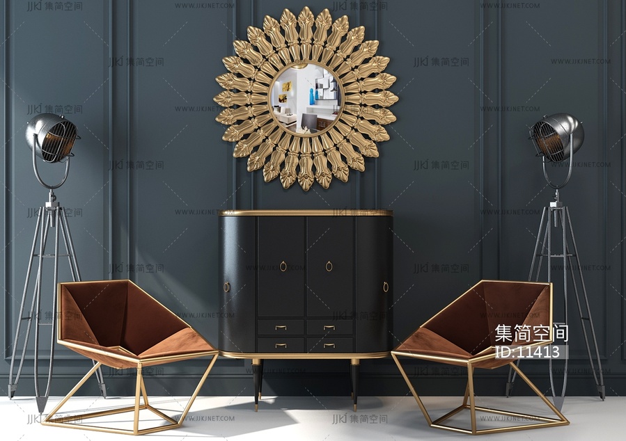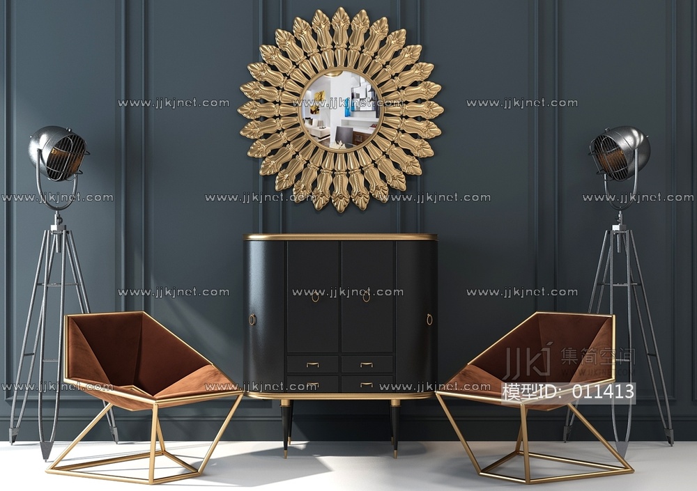 H40-1115现代端景柜装饰镜子休闲椅落地灯 3d模型下载 [模型ID:11413]