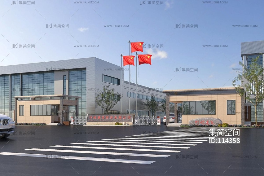 现代厂房、入口大门道闸门卫房,国旗旗杆、电动伸缩门 3d模型下载 [模型ID:114358]