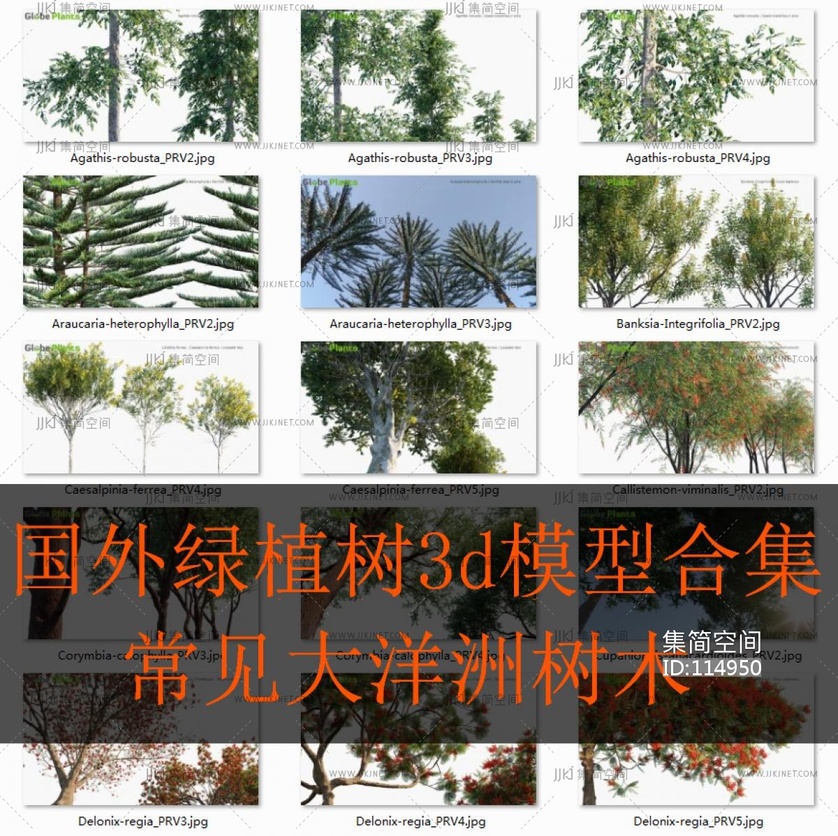 包含16种共90个常见的大洋洲树木主要在澳大利亚和新西兰树木植物3D模型,3DS MAX格式,所有模型均采用尽可能高的细节制作,准确表示用于Corona和VRay 渲染器,包含贴图材质