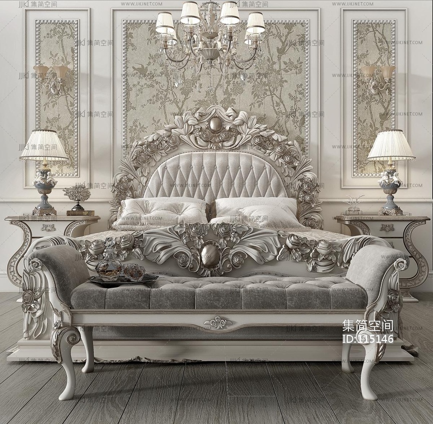 法式古典雕花双人床床尾凳 3d模型下载 [模型ID:115146]