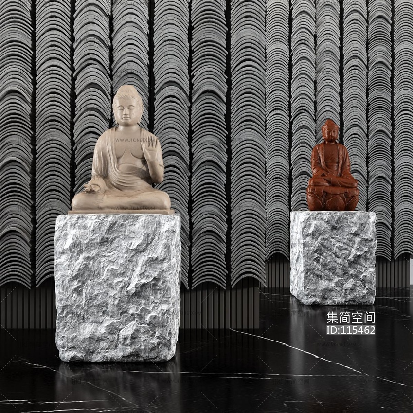 新中式佛像雕塑 石头墩子瓦片墙 3d模型下载 [模型ID:115462]