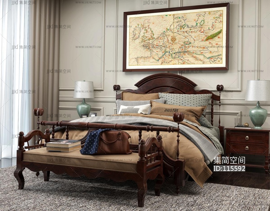 美式古典实木双人床 床头柜 台灯 脚榻 3d模型下载 [模型ID:115592]