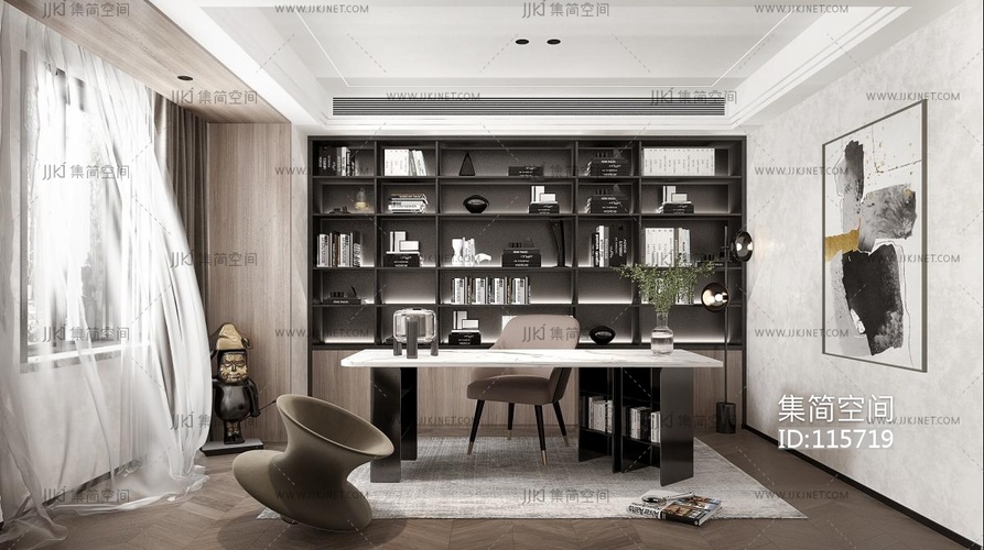 现代书房 书桌椅 壁柜 挂画 吊灯 书 盆栽 摆件3d模型下载