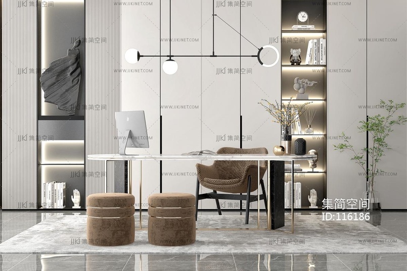 现代书房 书桌椅 壁柜 挂画 吊灯 书 盆栽 摆件3d模型下载