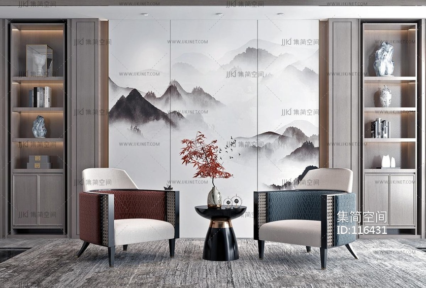 新中式皮革单人沙发,圆形边几花瓶 3d模型下载 [模型ID:116431]