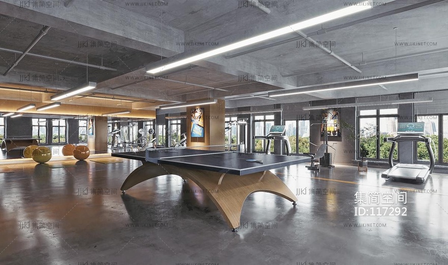 现代健身房_跑步机_健身器材_乒乓球桌台 3d模型下载 [模型ID:117292]