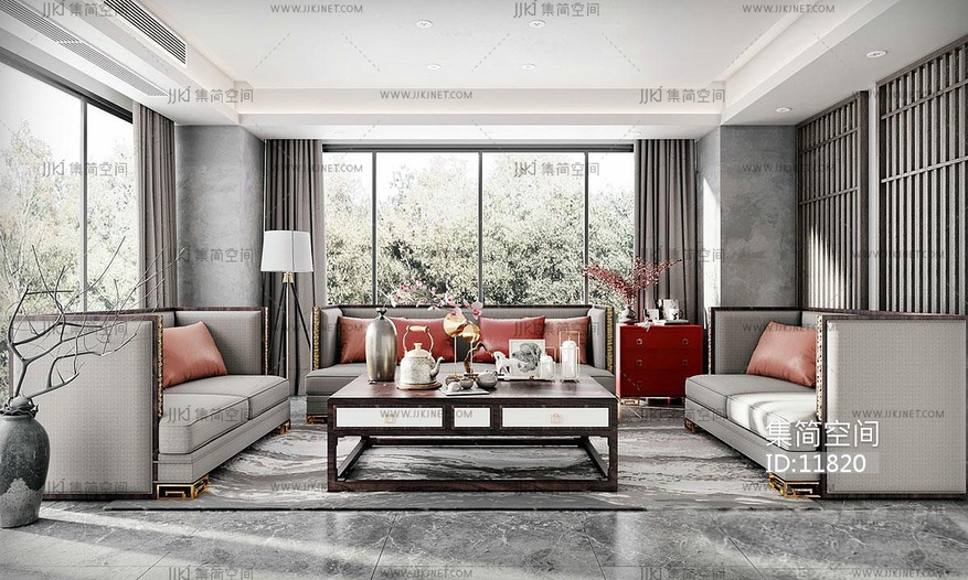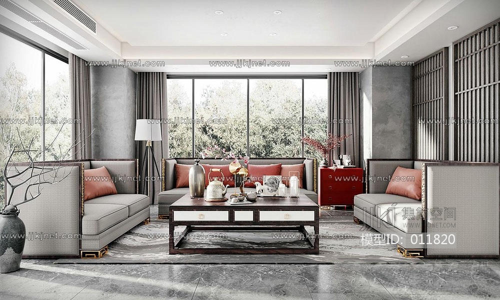现代中式客厅新中式沙发茶几陶罐干枝 3d模型下载 [模型ID:11820]