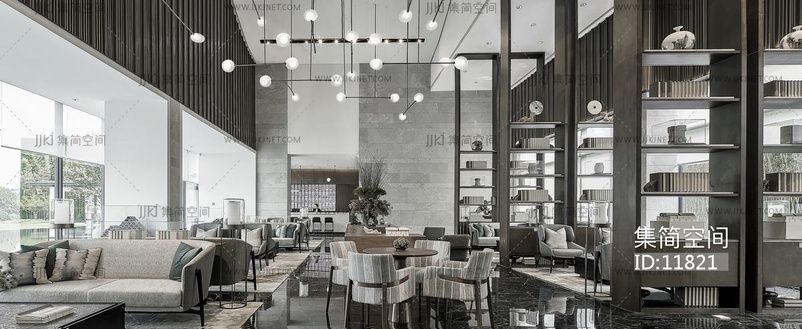 新中式售楼处休闲区休闲椅吊灯书柜书架 3d模型下载 [模型ID:11821]