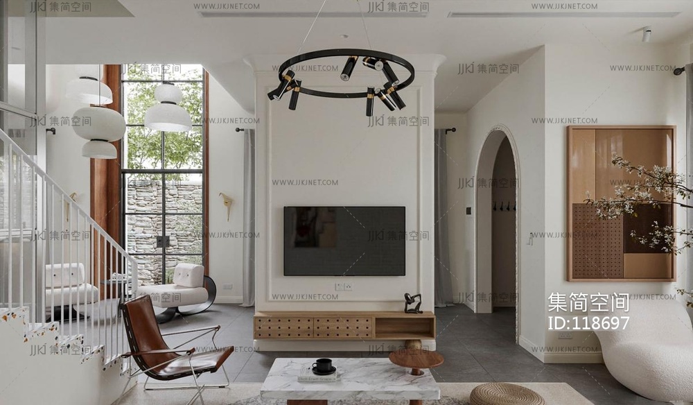 中古风客厅,美式客厅,圆形茶几,装饰画,移动电视,3d模型下载