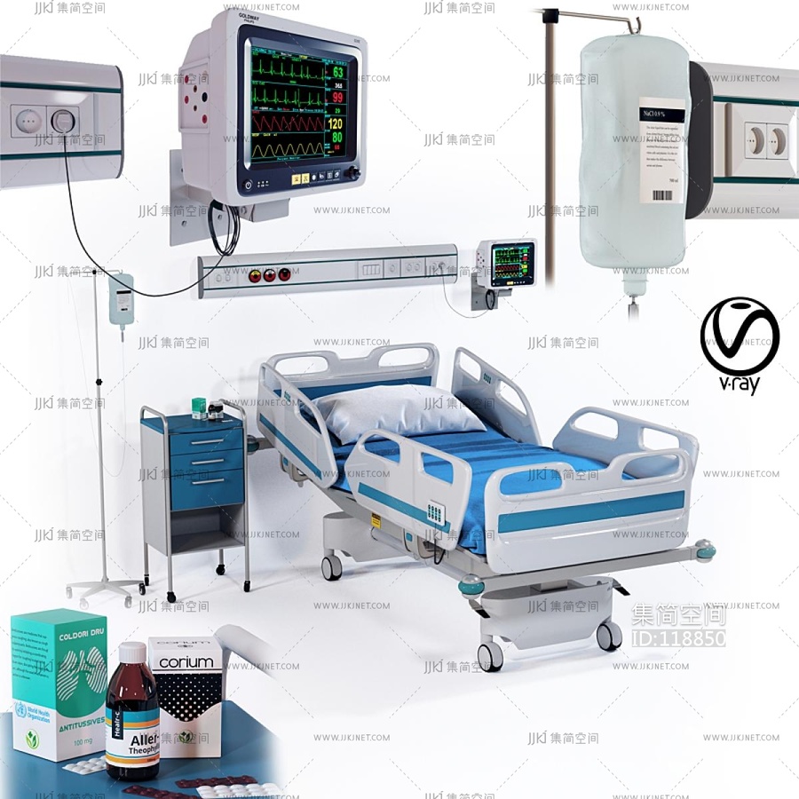 现代医院病人电动病床,医疗床,医疗带输液架,药品 3d模型下载 [模型ID:118850]